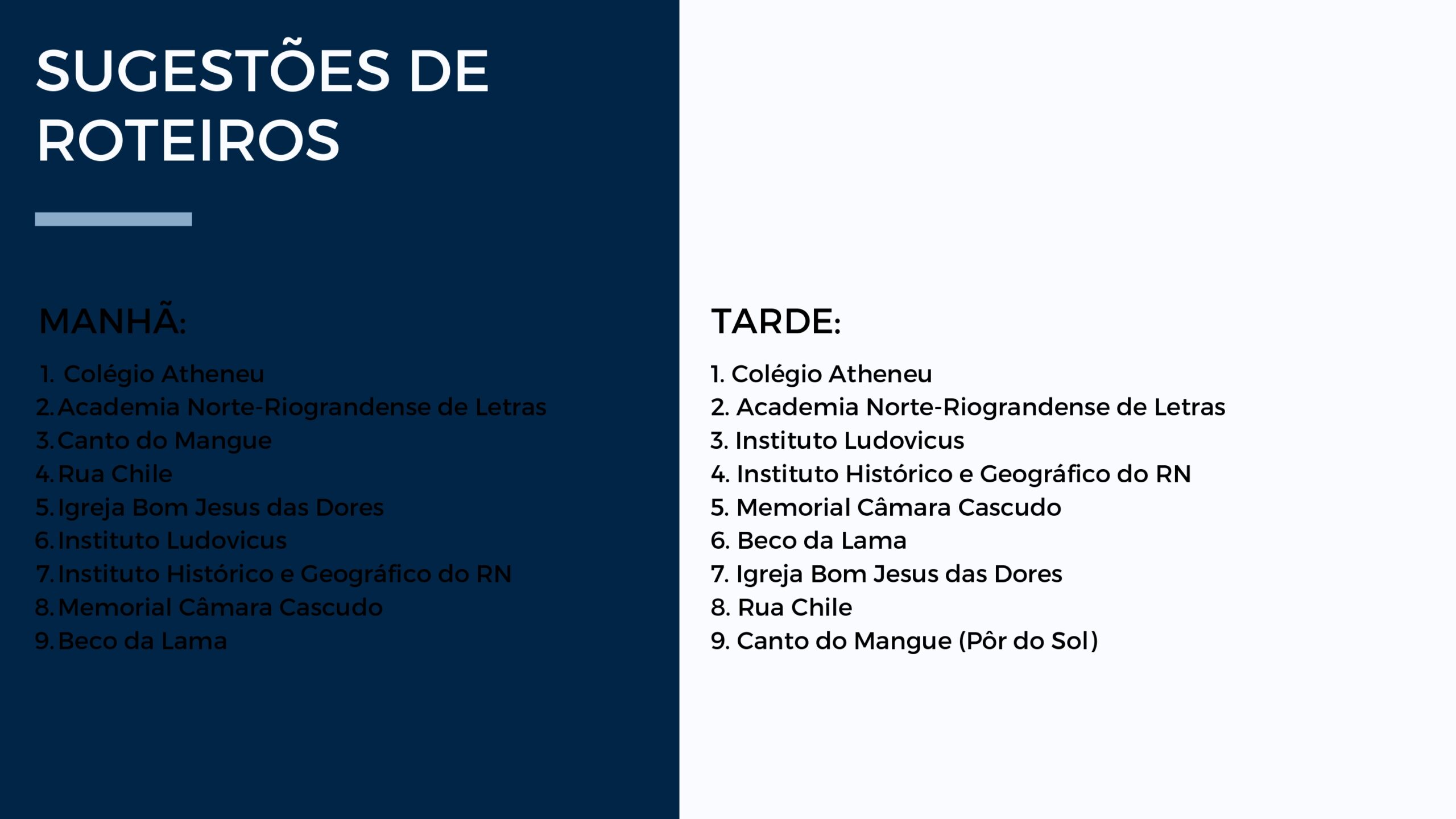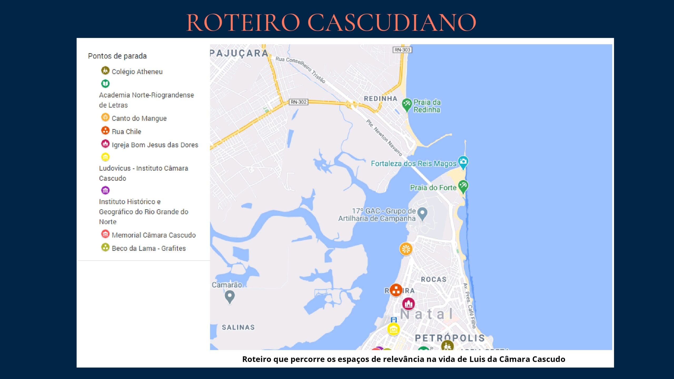 Confira o roteiro na íntegra através do link https://visit.natal.br/assets/roteiros/roteiro-cascudiano.pdf